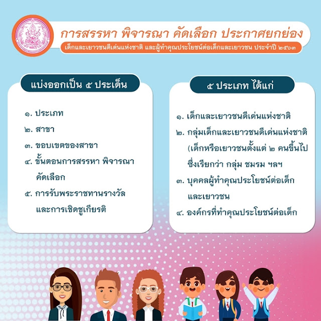 ได้แก่ 1.เด็กและเยาวชนดีเด่นแห่งชาติ 2.กลุ่มเด็กและเยาวชนดีเด่นแห่งชาติ 3.บุคคลผู้ทำคุณประโยชน์ต่อเด็กและเยาวชน 4.องค์กรที่ทำคุณประโยชน์ต่อเด็กและเยาวชน โดยจำแนกออกเป็น 11 สาขา ประกอบด้วย 1.สาขากฎหมายและการปกป้องคุ้มครองสิทธิเด็กและเยาวชน 2.สาขาการศึกษาและวิชาการ 3.สาขากีฬาและนันทนาการ 4.สาขาคณิตศาสตร์ วิทยาศาสตร์ คอมพิวเตอร์ และเทคโนโลยี 5.สาขาทรัพยากรธรรมชาติและสิ่งแวดล้อม 6.สาขานวัตกรรมและสิ่งประดิษฐ์ 7.สาขาพัฒนาเยาวชน บำเพ็ญประโยชน์ และส่งเสริมการมีส่วนร่วมของเยาวชน 8.สาขาศิลปวัฒนธรรม 9.สาขาศีลธรรม จริยธรรม และคุณธรรม 10.สาขาสื่อมวลชนเพื่อเด็กและเยาวชนที่ป้องกันปัญหาสังคม และ 11.สาขาอาชีพ